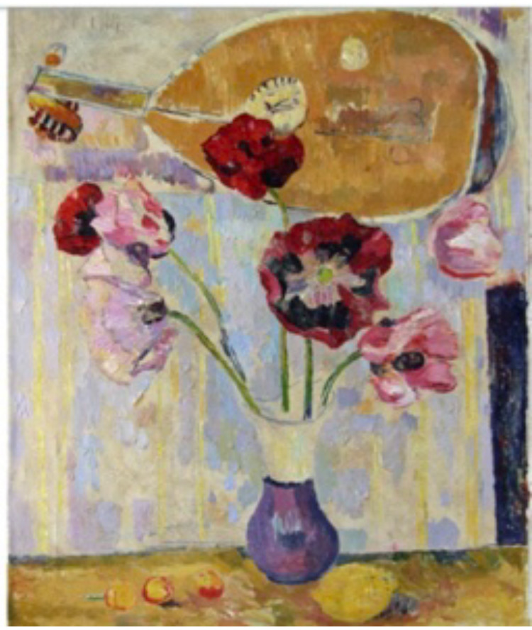 Purple Poppies in vase with a Lute.