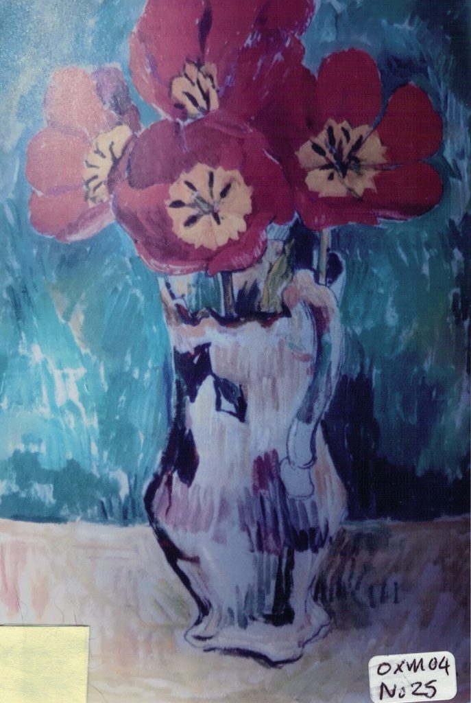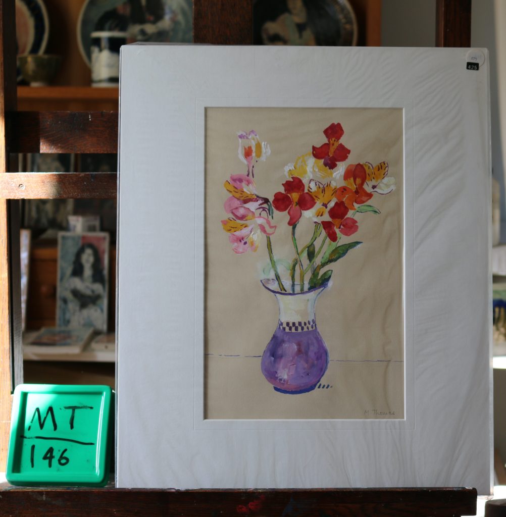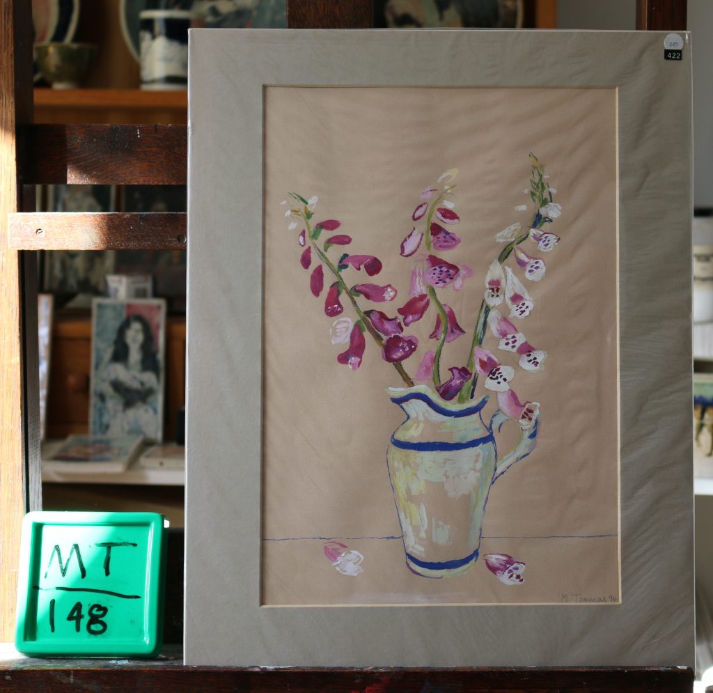 Foxgloves in cream striped jug. Gouc.