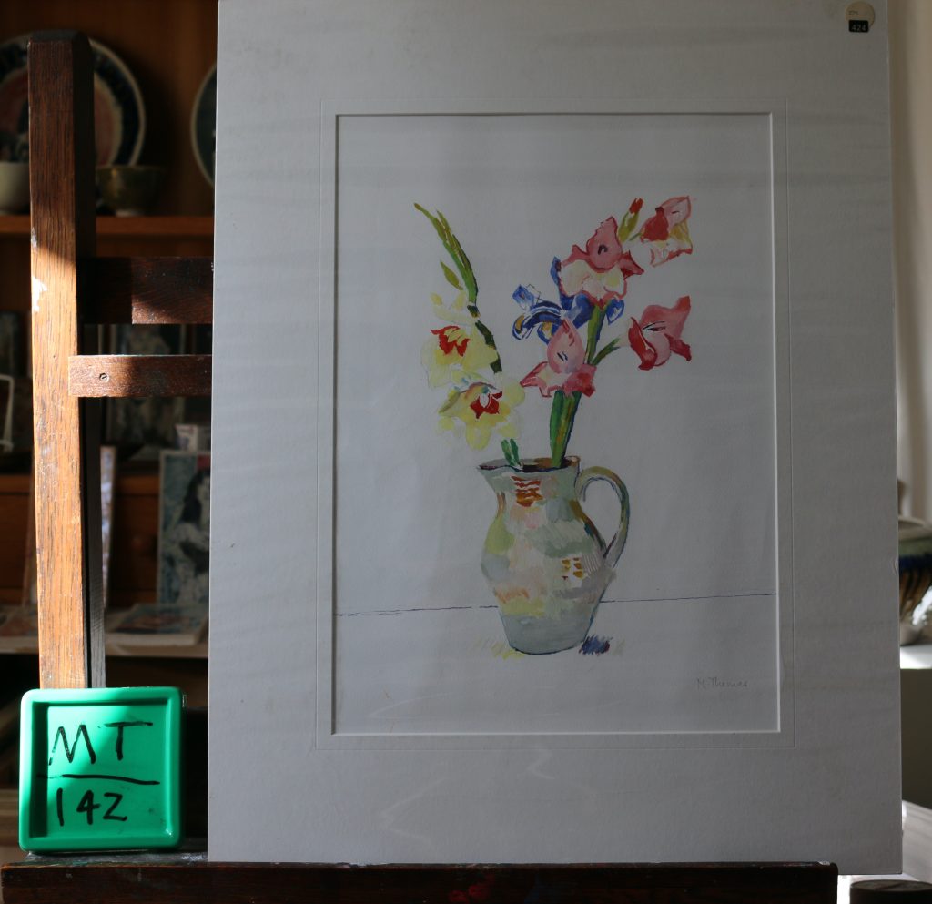 Gladioli in grey jug. Gouache.