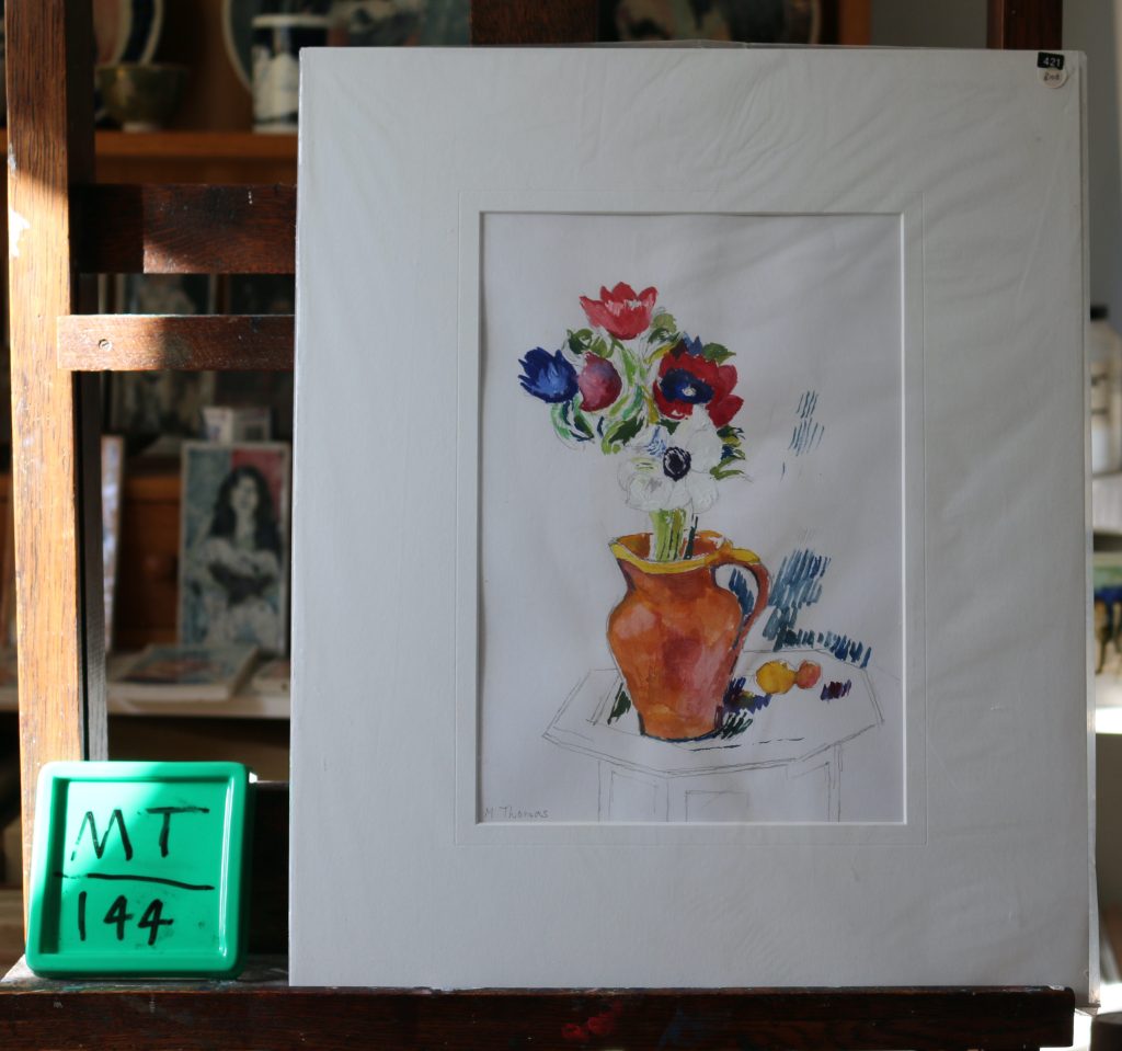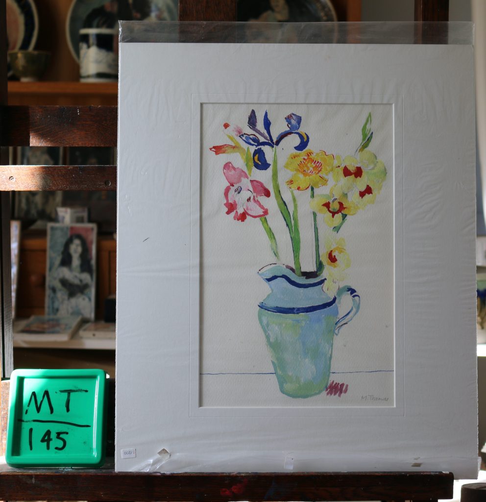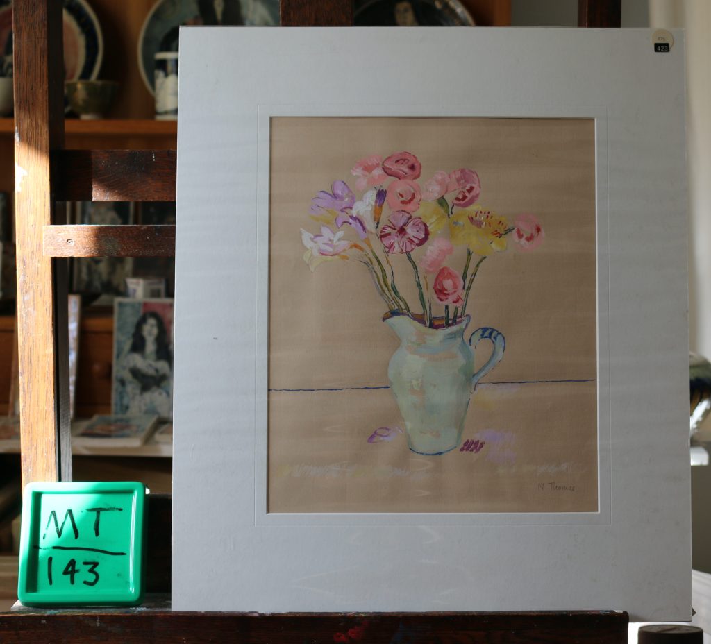 Flowers in cream handled jug. Gouache.