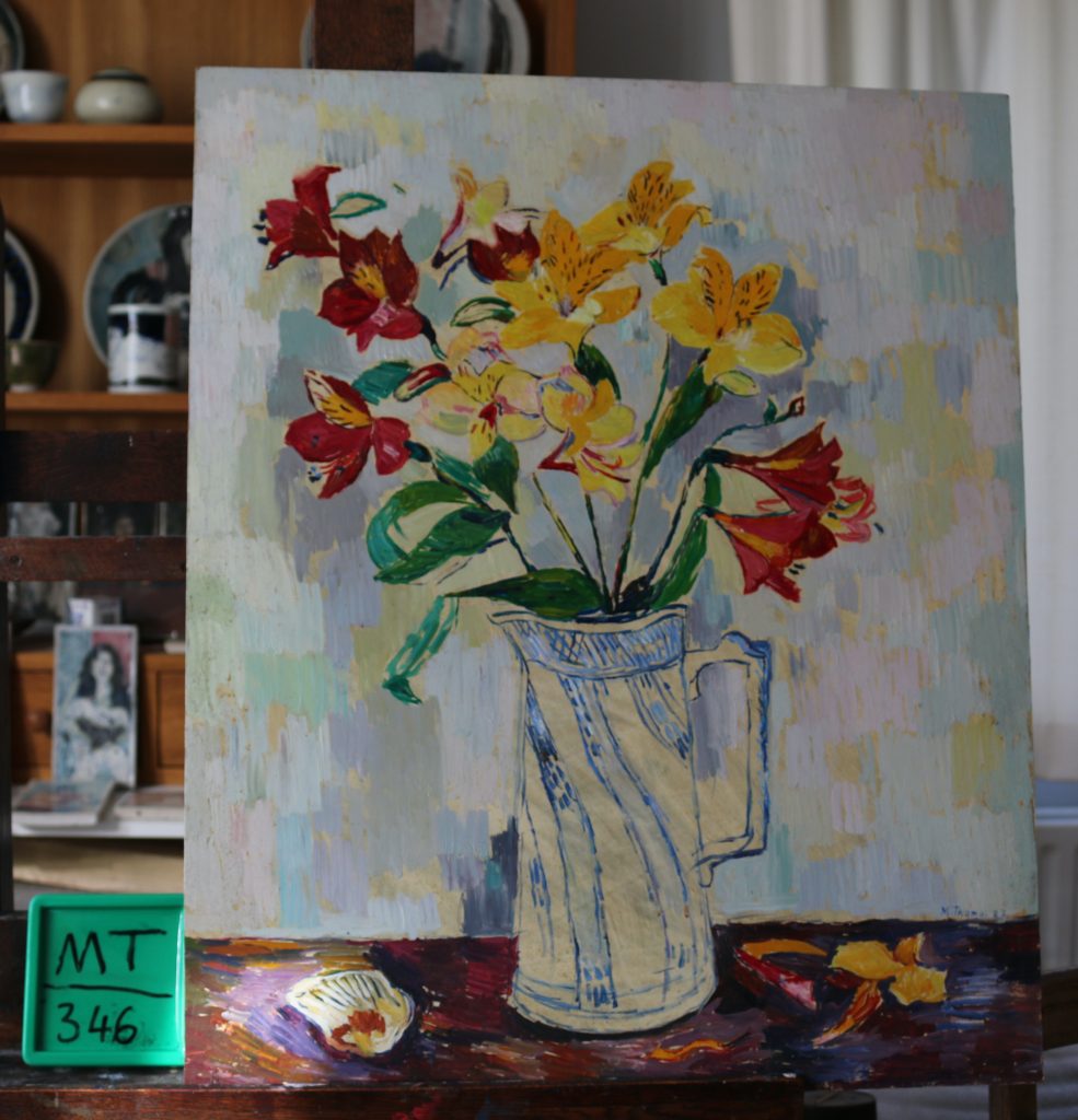 Alstroemerias in white jug.