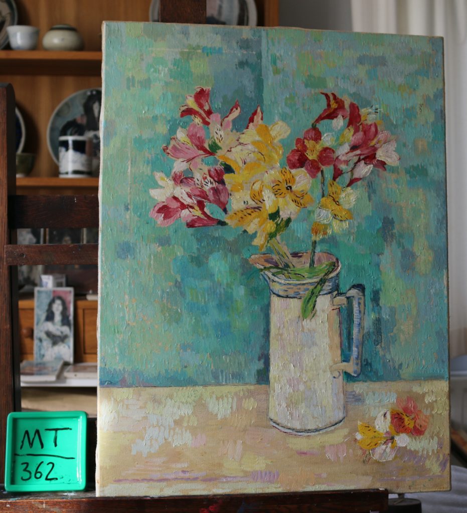 Alstroemerias in blue striped white jug.