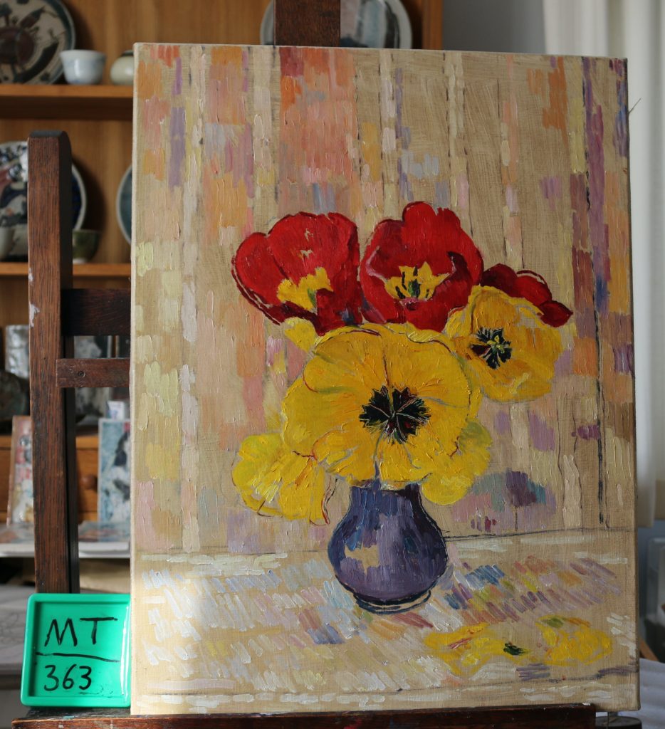 Yellow & red Tulips in purple vase.