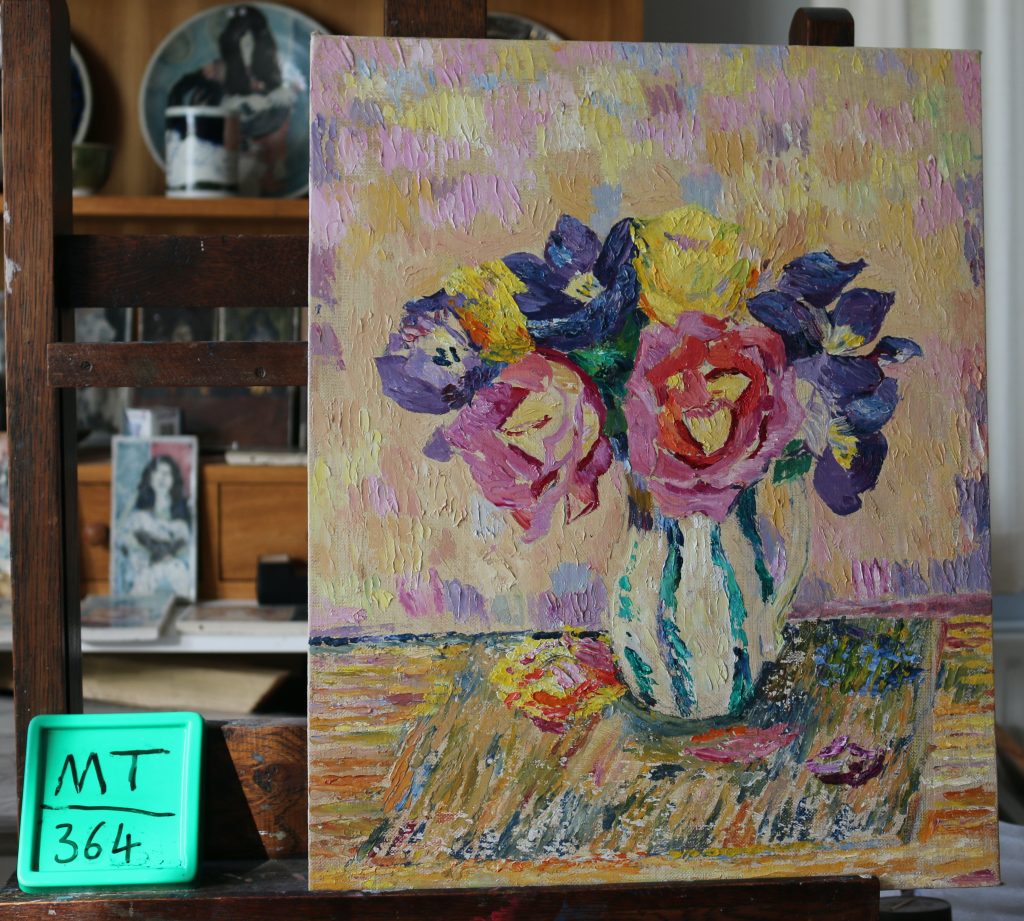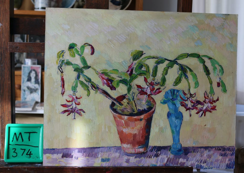 Christmas Cactus and blue vase.