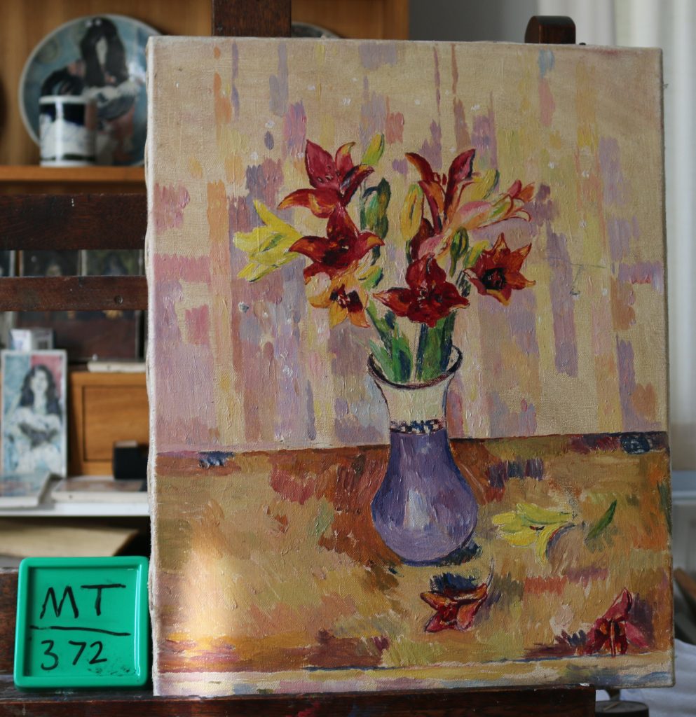 Burgundy Daylilies in a purple vase.