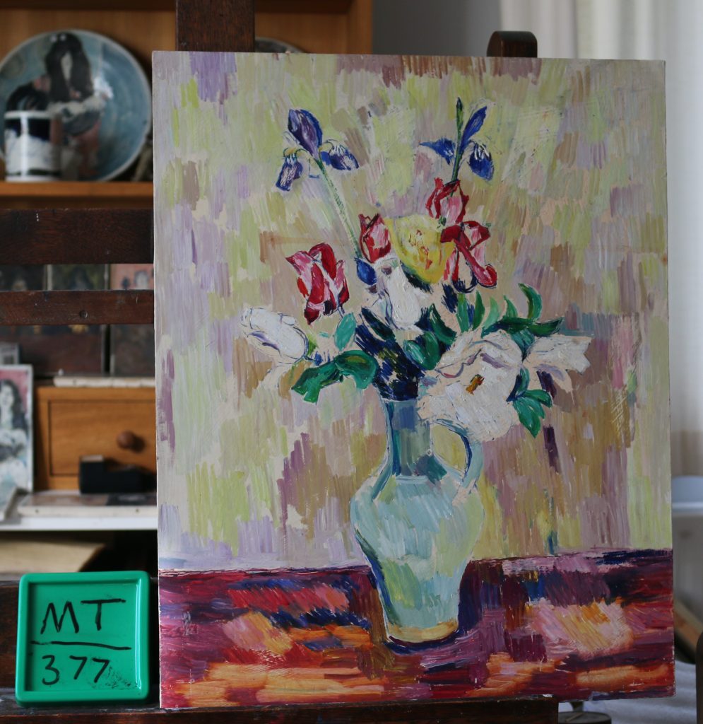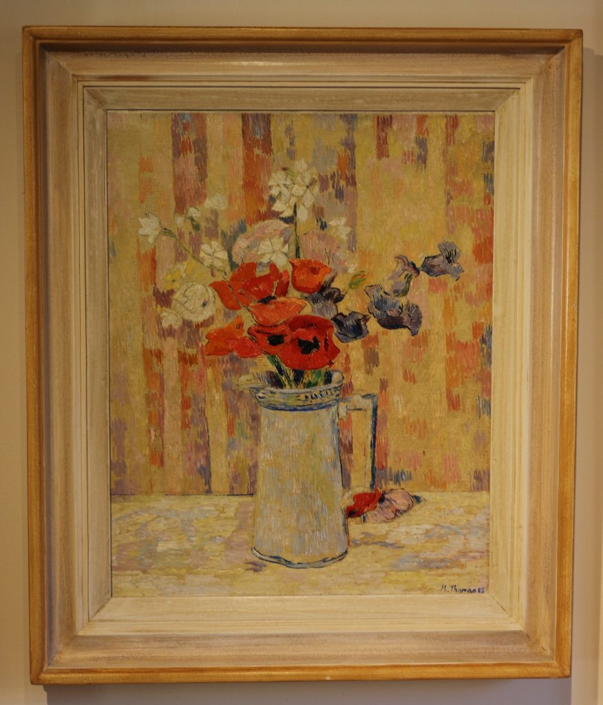 Flowers in a blue striped jug.