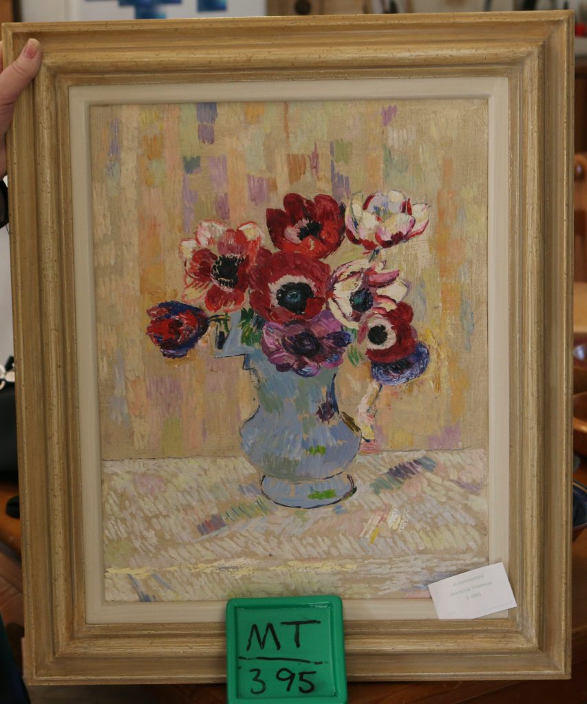 Anemones in blue vase on white cloth.