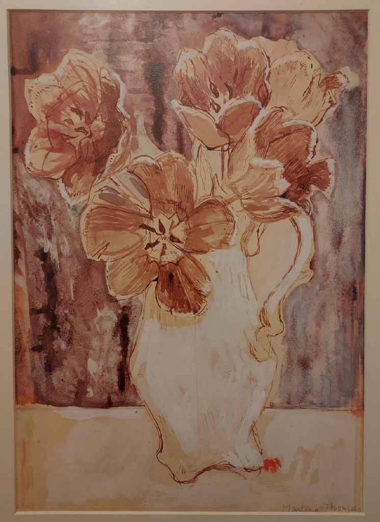 Red Tulips in white jug. Ink wash.
