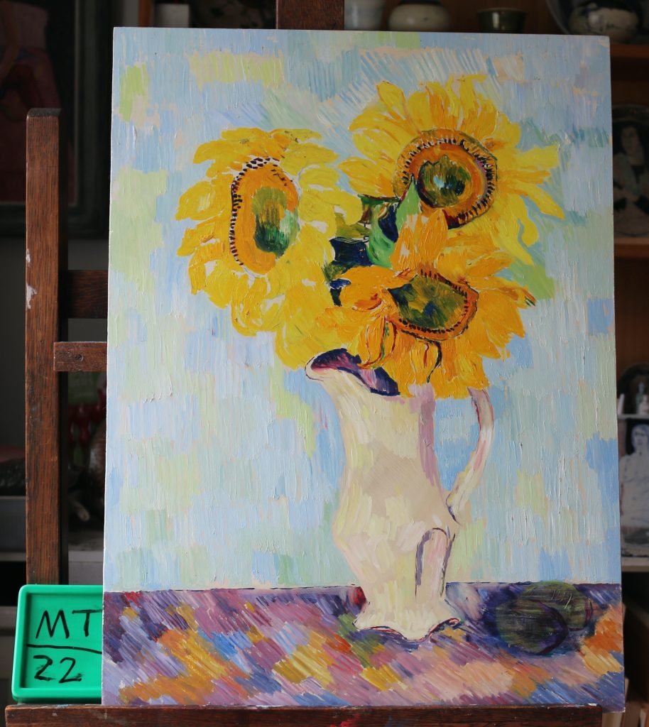 Sunflowers x3 in cream jug.