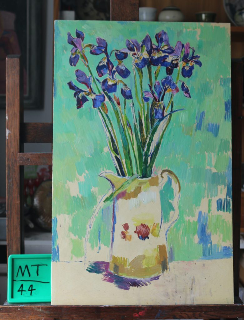 Blue Iris in brown jug.