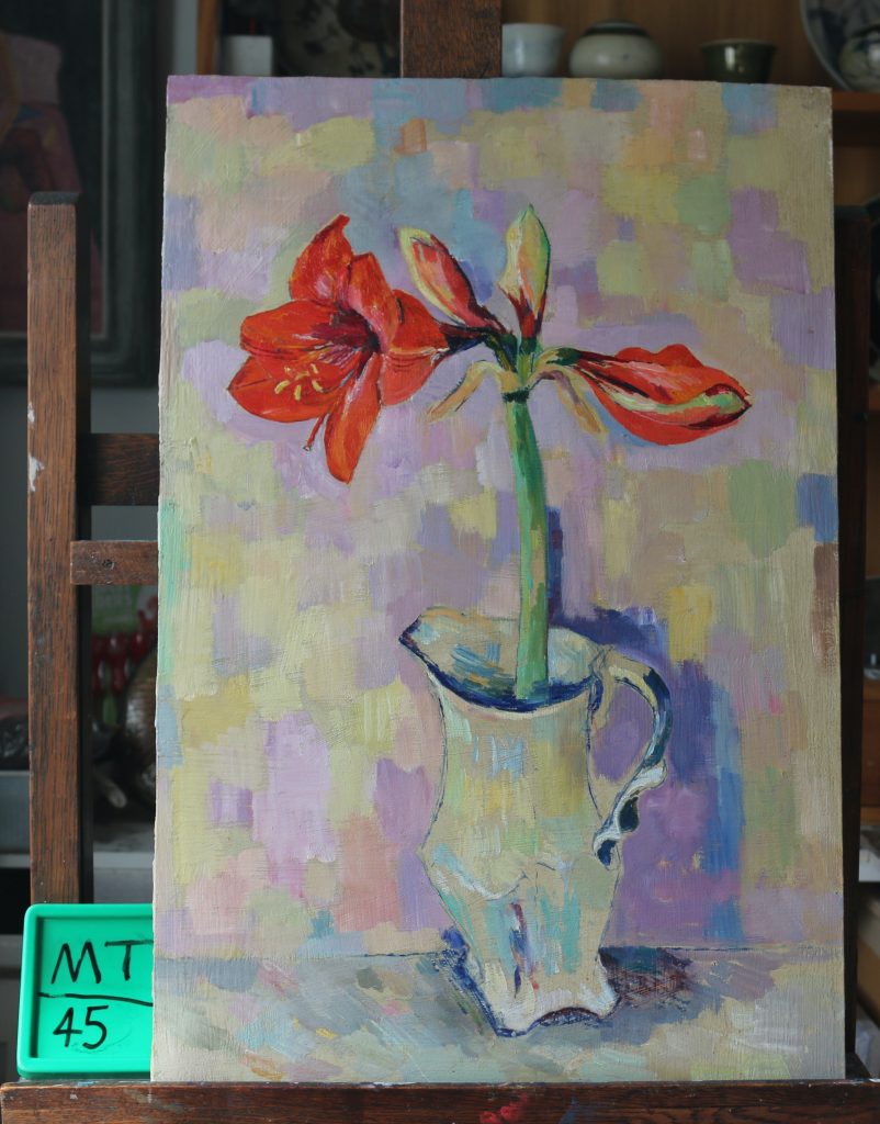 Red Amaryllis in cream jug.