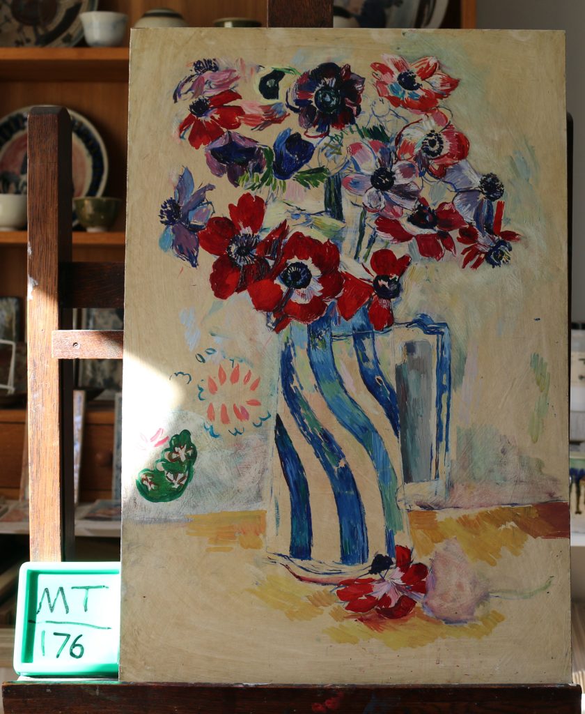 Anemones in blue striped vase.