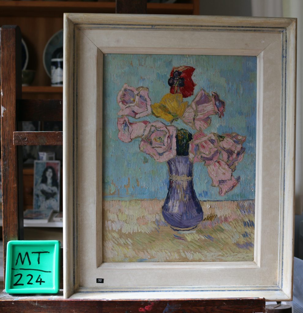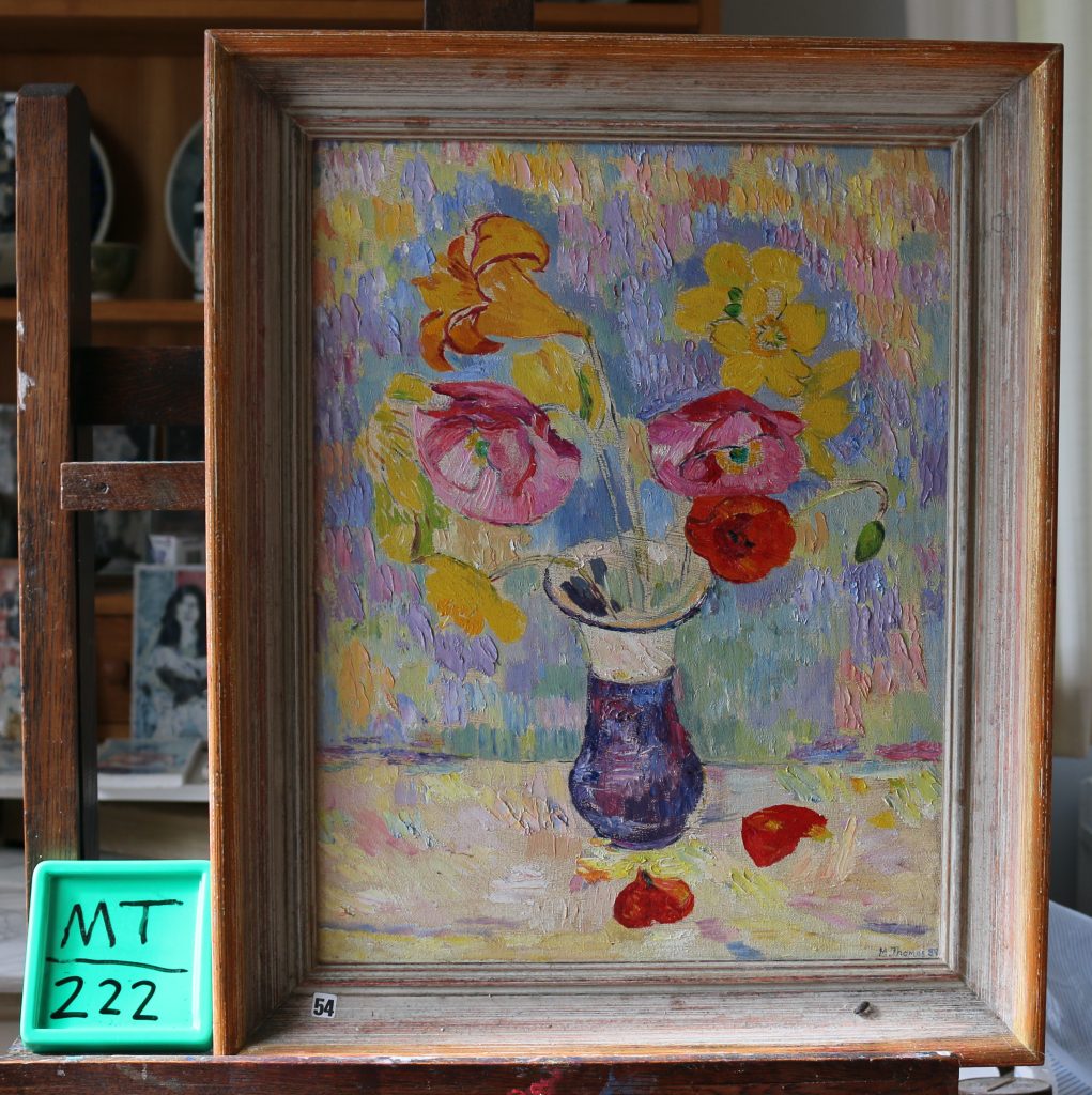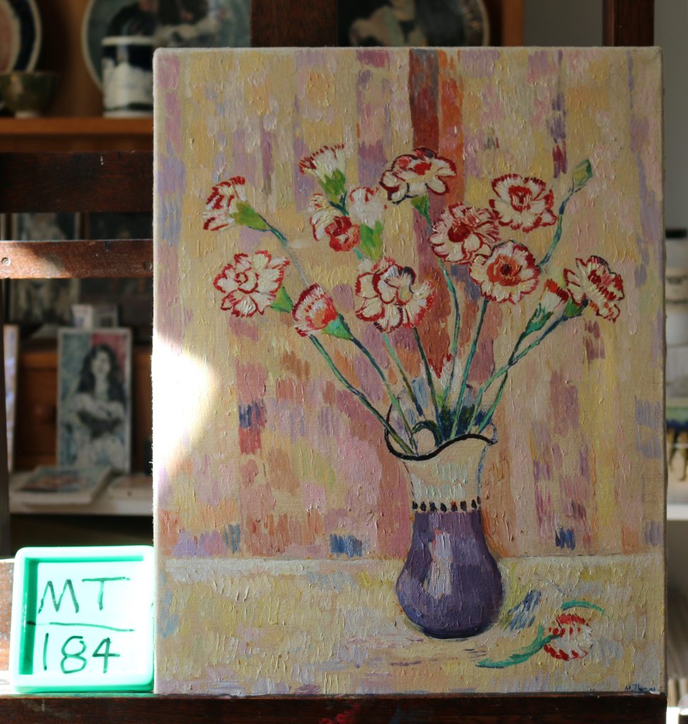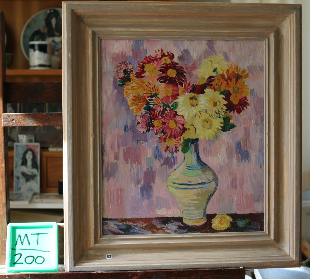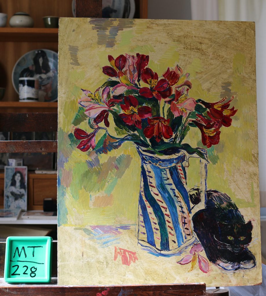 Alstroemerias in blue strip jug, cat.